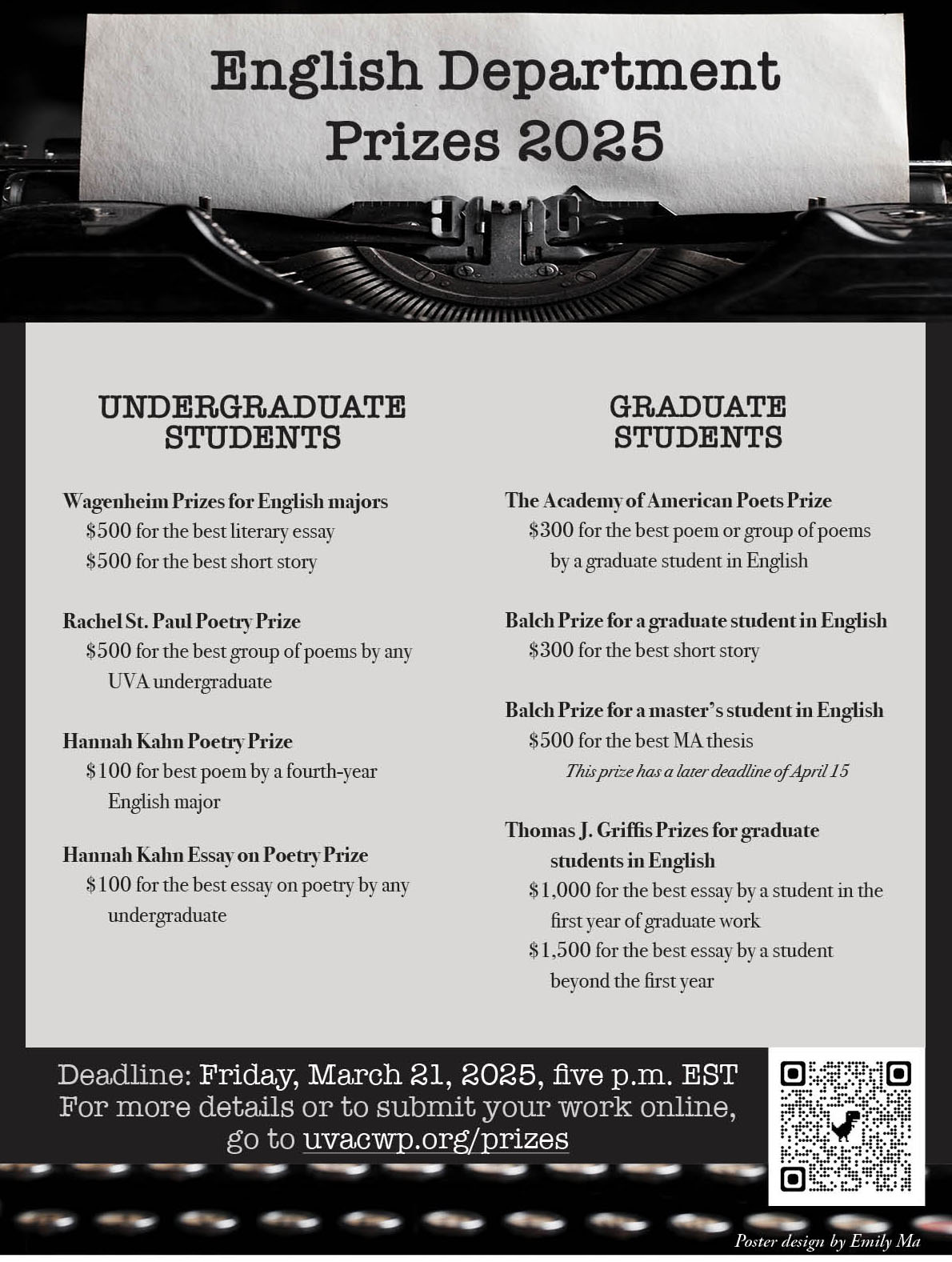 Only currently enrolled UVA undergraduate students are eligible for the undergraduate prizes. Some undergraduate prizes are restricted by major or year, but some are open to all years and majors. At the graduate level, our prizes are limited to students currently studying in the UVA English Department only.